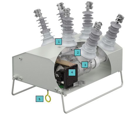 4. Módulo de corte equipado con el innovador interruptor en vacío de Tavrida Electric. Tavrida Electric ha simplificado al máximo la estructura mecánica del interruptor en vacío. Utiliza tres actuadores magnéticos de una sola bobina, una por polo. Todos los elementos de corte de un polo se montan a lo largo de un solo eje. Todos los movimientos mecánicos son, por lo tanto, directos y lineales. Los tres actuadores están instalados en un marco de acero y mecánicamente unidos por una varilla de sincronización.